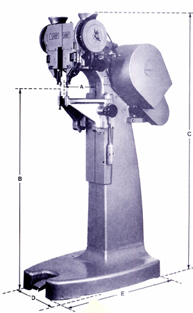 A power Operated Automatic Twin Feed Machine for setting two Semi-Tubular, Tubular or Bifurcated Rivets up to 16 mm (5/8") in length at one stroke. The rivet centres are supplied fixed within the limits 14mm (9/16") to 89 mm (3.1/2"). This standard specification can be extended to increase the scope of the machine. The maximum rivet gauge, which will depend on the type of rivet and the material from which it is made, is as follows: |